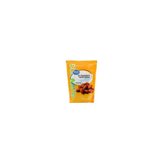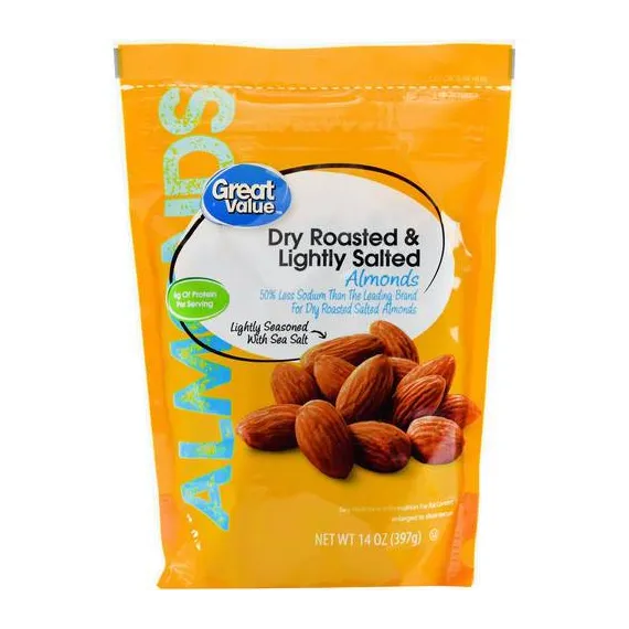 Details Ingredients DRY ROASTED ALMONDS, SEA SALT. Product features Contains 55mg sodium per serving compared to 135mg sodium in the leading brand for dry roasted salted almonds.Taste the bold flavor and crunch of Great Value Dry Roasted & Lightly Salted Almonds. This 14-ounce bag is the perfect size to keep at your desk at work or in the pantry for a quick snack within easy reach. With 6 grams of protein per serving, these tasty nuts will keep you full of energy for whatever the day throws your way. The delightful flavor of these almonds will be a hit when you share them with friends, family, and coworkers. Grab a handful whenever you want to satisfy your snack craving. Roasting the almonds gives life to the nutty flavor, which blends seamlessly with the light coating of sea salt. These whole almonds are packaged in a convenient, resealable bag that is ideal for packing on road trips, tailgates, lunches and picnics. Make your tastebuds sing with Great Value Dry Roasted & Lightly Salted Almonds!Great Value products provide families with affordable, high quality grocery and household consumable options. With our wide range of product categories spanning grocery and household consumables, we offer you a variety of products for your family's needs. Our products are conveniently available online and in Walmart stores nationwide, allowing you to stock up and save money at the same time. Whole roasted almondsDry roasted and lightly salted14oz resealable bag6 grams of protein Net Quantity of Content 14 X 1 oz
