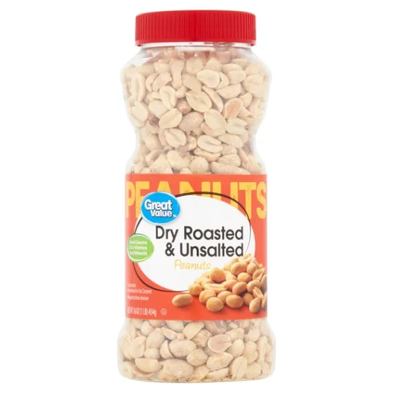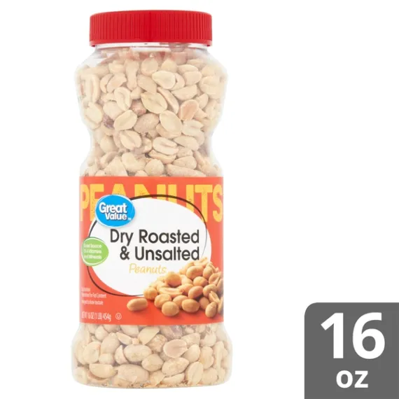 Details Ingredients PEANUTS, DRY ROASTED. Product features Grab Great Value Dry Roasted & Unsalted Peanuts for a protein packed snack that the whole family can enjoy. A good source of 4 vitamins and minerals and low in carbohydrates, our dry roasted and unsalted peanuts also have no sodium, ideal for anyone watching their salt intake. Dry roasted for that classic peanut flavor, these peanuts can be used to enhance a variety of meals. Add crunch and protein to salads, make homemade trail mix, or add as a topping to an ice cream sundae bar. Use atop Pad Thai for that essential crunchy finish, or make your own homemade chunky peanut butter as an after-school project with kids. Great Value Dry Roasted & Unsalted Peanuts come with an easy screw top lid, making them a convenient choice for the family on-the-go and an ideal everyday snack!Great Value products provide families with affordable, high quality grocery and household consumable options. With our wide range of product categories spanning grocery and household consumables, we offer you a variety of products for your family's needs. Our products are conveniently available online and in Walmart stores nationwide, allowing you to stock up and save money at the same time. Good source for 4 vitamins and mineralsLow in carbohydratesGood source of protein160 calories per serving16 servings per containerResealable container Special Features Great for you Net Quantity of Content 16 X 1 oz