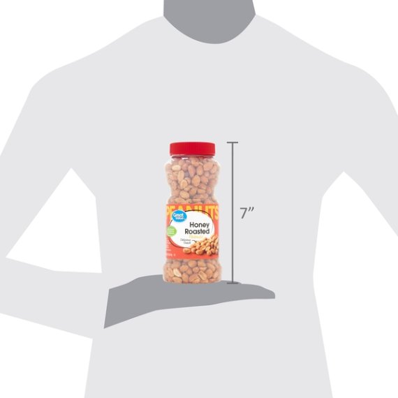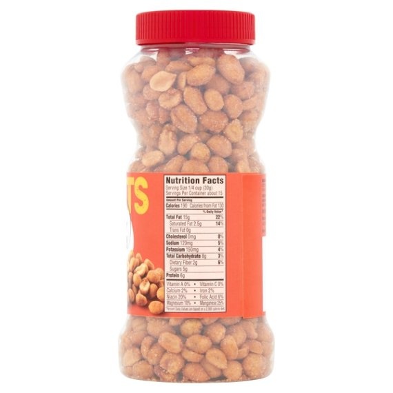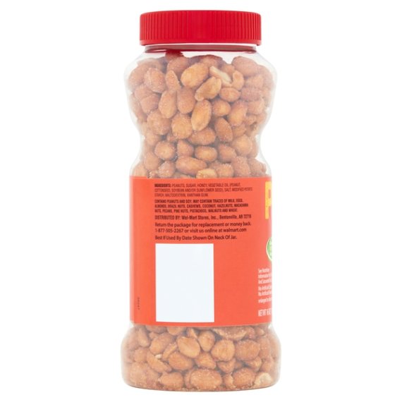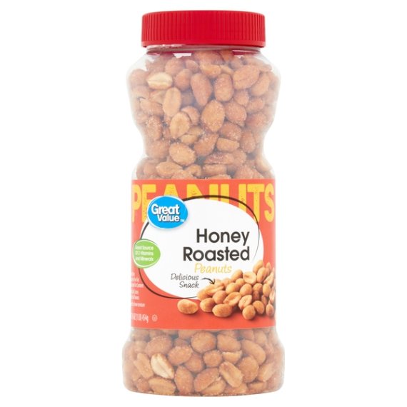Details Ingredients PEANUTS, SUGAR, HONEY, VEGETABLE OIL (PEANUT, COTTONSEED, SOYBEAN AND/OR SUNFLOWER SEED), SALT, MODIFIED POTATO STARCH, MALTODEXTRIN, XANTHAN GUM. Show more Product features Grab Great Value Honey Roasted Peanuts for a delicious snack that the whole family can enjoy. A good source of 3 vitamins and minerals and low in carbohydrates, our honey roasted peanuts are also low in sodium, ideal for people watching their salt intake. Honey roasted for that classic sweet peanut flavor, these peanuts can be used to enhance a variety of meals. Add crunch and protein to salads, make homemade trail mix by adding raisins and chocolate, or add as a topping to an ice cream sundae bar. Make your own homemade sweet and chunky peanut butter as an after-school project with kids. What's more, Great Value Dry Roasted Honey Roasted Peanuts come with an easy screw top lid, making them a convenient choice for the family on-the-go.Great Value products provide families with affordable, high quality grocery and household consumable options. With our wide range of product categories spanning grocery and household consumables, we offer you a variety of products for your family's needs. Our products are conveniently available online and in Walmart stores nationwide, allowing you to stock up and save money at the same time. Good source of 3 vitamins and mineralsDelicious snackMade with real honeyLow in carbohydratesGood source of proteinConvenient screw top lid Net Quantity of Content ABOUT 15 X 0.25 cup