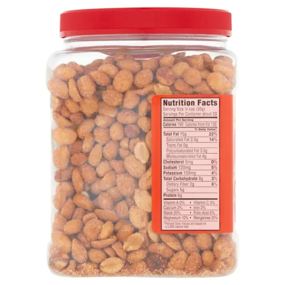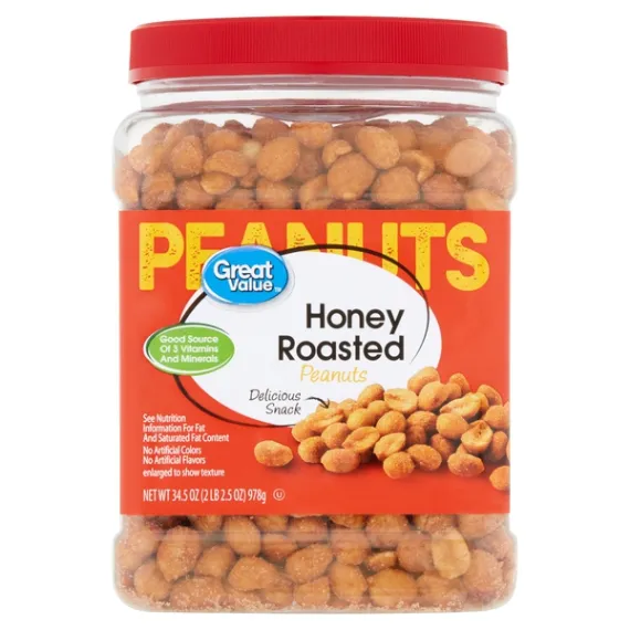 Details Ingredients Peanuts, Sugar, Honey, Vegetable Oil (Peanut, Cottonseed, Soybean and/or Sunflower Seed), Salt, Modified Potato Starch, Maltodextrin, Xanthan Gum Show more Product features Savor the sweet and satisfying flavor of Great Value Honey Roasted Peanuts. This 34.5-ounce clear plastic container with a screw-on lid is filled with delicious peanuts, roasted with smooth honey. Not only are these peanuts a classy and flavorful snack for your next party, but they are also a healthy treat, with 6 grams of protein per serving. They make for perfect bar nuts at your next movie night, and you might as well make them a permanent fixture on your coffee table. Throw these peanuts into a plastic bag as a quick addition to school lunches or picnic snacks. Take the whole container with you for tailgates and barbecues. They are sure to be a hit with everyone who tries them. Great Value Honey Roasted Peanuts are a classic, healthy, and most of all, delicious snack for every occasion.Great Value products provide families with affordable, high quality grocery and household consumable options. With our wide range of product categories spanning grocery and household consumables, we offer you a variety of products for your family's needs. Our products are conveniently available online and in Walmart stores nationwide, allowing you to stock up and save money at the same time. Honey roasted peanuts34.5oz clear plastic container with screw on lidGood source of 3 vitamins and minerals6 grams of protein Special Features Great for you Net Quantity of Content 33 X ¼ cup (30g)