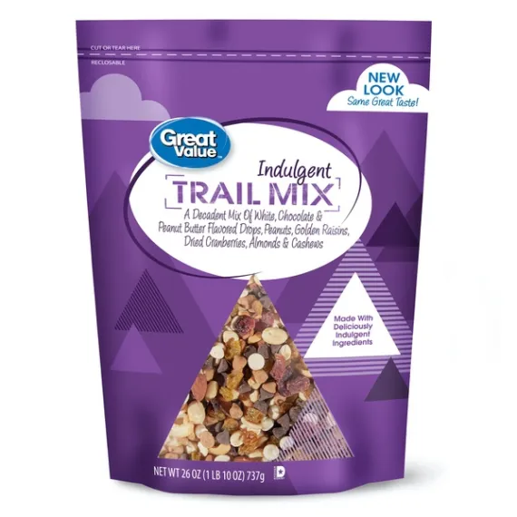 Details Ingredients White Confection Drops (Sugar, Nonfat Dry Milk Powder, Palm Kernel And Palm Oil, Distilled Monoglycerides, Soy Lecithin, Titanium Dioxide [Color], Artificial Flavor), Semisweet Chocolate Chips (Sugar, Chocolate Liquor, Cocoa Butter, Dextrose, Soy Lecithin, Vanillin [Artificial Flavor]), Peanuts (Peanuts, Peanut Oil Salt), Peanut Butter Flavored Drops (Sugar, Palm Kernel And Palm Oil, Partially Defatted Peanut Flour, Whey, Nonfat Dry Milk, Peanuts, Anhydrous Dextrose, Salt, Soy Lecithin), Golden Raisins (Raisins, Sulfur Dioxide [To Preserve Color]), Dried Cranberries, Sugar, Citric acid, Sunflower Oil, Elderberry Juice Concentrate [Color]), Almonds (Almonds, Peanut Oil, Salt), Cashews (Cashews, Peanut Oil, Salt). Show more Product features Ensure you have an essential snack for a long car trip or hiking expedition with Great Value Indulgent Trail Mix. It's a blend of sweet and crunchy ingredients including peanuts, golden raisins, dried cranberries, almonds, cashews and white chocolate and peanut butter drops. This decadent kosher trail mix provides you with the fuel you need to keep trekking along.Great Value products provide families with affordable, high quality grocery and household consumable options. With our wide range of product categories spanning grocery and household consumables, we offer you a variety of products for your familyâs needs. Our products are conveniently available online and in Walmart stores nationwide, allowing you to stock up and save money at the same time. Great Value Indulgent Trail Mix, 26 oz:Decadent mix of white, chocolate and peanut butter flavored drops, peanuts, golden raisins and nutsCombination of sweet and crunchy ingredientsFuel for long car rides and hiking tripsKosher dairy Net Quantity of Content 25 X 3 Tbsp. (29g)