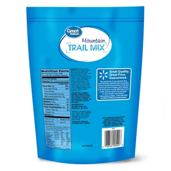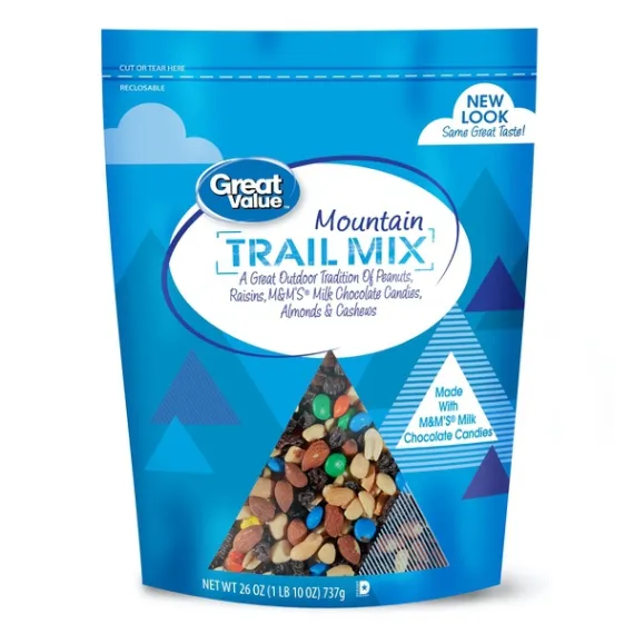 Details Ingredients Peanuts (Peanuts, Peanut Oil, Salt), Raisins, M&M's Milk Chocolate Candies (Milk Chocolate [Sugar, Chocolate, Skim Milk, Cocoa Butter, Lactose, Milkfat, Soy Lecithin, Salt, Artificial Flavors], Sugar, Cornstarch, Less Than 1%: Corn Syrup, Dextrin, Coloring[Includes Blue 1 Lake, Yellow 6, Red 40, Yellow 5, Blue 2 Lake, Yellow 6 Lake, Yellow 5 Lake, Blue 2], Gum Acacia), Almonds (Almonds, Peanut Oil, Salt), Cashews (Cashews, Peanut Oil, Salt). Show more Product features Great Value Mountain Trail Mix is made with a sweet and salty combination of flavors that are perfect to take with you on the go . This great outdoor tradition is made with a wholesome blend of sweet and crunchy ingredients including peanuts, raisins, M&M's milk chocolate candies, almonds and cashews. This Great Value trail mix provides you with the fuel you need to keep trekking along in the woods, on the mountain or in the car. It comes packaged inside a resealable bag to help maintain freshness after every snack. With 22 servings per container, there is plenty to share with friends and family. Tackle your hunger with Great Value Mountain Trail Mix.Great Value products provide families with affordable, high-quality grocery and household consumable options. With our wide range of product categories spanning grocery and household consumables, we offer you a variety of products for your familyâs needs. Our products are conveniently available online and in Walmart stores nationwide, allowing you to stock up and save money at the same time. Great Value Tropical Trail Mix, 26 oz:Flavor expeditionMix of peanuts, raisins, M&M's chocolate candies, almonds and cashewsPerfect for on the go snackingSweet and crunchy ingredients22 servings per container Net Quantity of Content 22 X 3 Tbs