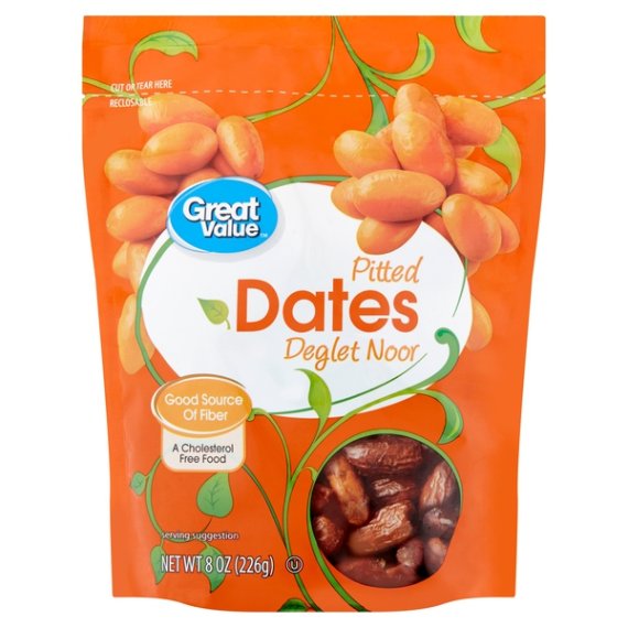 Details Ingredients Dates Product features Great Value Pitted Deglet Noor Dates are a delightful, healthy treat that keeps you full all day long. This cholesterol-free fruit is packed with nutrients and is also high in fiber. Looking for the perfect on the go snack that can be tossed in a backpack, purse, or briefcase? Look no further! Get your day started on the right foot by mixing these delightful dates into your favorite yogurt, cereal, oatmeal, or smoothie. This sticky fruit is also a wonderful addition to your favorite salad or trail mix. Our resealable packaging makes it easy to have as much as you want and still save some for later. Want to upgrade your holiday meals? Take your Thanksgiving stuffing up a notch with a few chopped dates for a sweet and savory flavor. The best thing about Great Value Pitted Deglet Noor Dates is you can enjoy them any way you like!Great Value products provide families with affordable, high quality grocery and household consumable options. With our wide range of product categories spanning grocery and household consumables, we offer you a variety of products for your family's needs. Our products are conveniently available online and in Walmart stores nationwide, allowing you to stock up and save money at the same time. High in fiberCholesterol-freeNutritious snackResealable bag Net Quantity of Content 6 X 1/4 cup (40g)