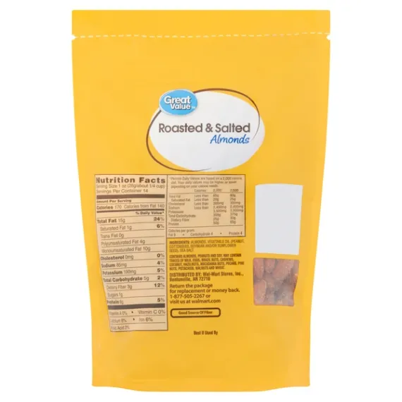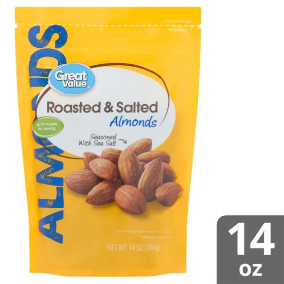 Details Ingredients ALMONDS, VEGETABLE OIL (PEANUT, COTTONSEED, SOYBEAN AND/OR SUNFLOWER SEED), SEA SALT. Product features Taste the bold flavor and crunch of Great Value Roasted & Salted Almonds. This 14-ounce bag is the perfect size to keep at your desk at work or in the pantry for a quick snack within easy reach. With 6 grams of protein per serving, these tasty nuts will keep you full of energy for whatever the day throws your way. The delightful flavor of these almonds will be a hit when you share them with friends, family, and coworkers. Grab a handful whenever you want to satisfy your craving. Roasting the almonds gives life to the nutty flavor, which blends seamlessly with the sea salt coating. These whole almonds are packaged in a convenient, resealable bag that is perfect for packing on road trips, tailgates, and picnics. Make your tastebuds sing with Great Value Roasted & Salted Almonds!Great Value products provide families with affordable, high quality grocery and household consumable options. With our wide range of product categories spanning grocery and household consumables, we offer you a variety of products for your family's needs. Our products are conveniently available online and in Walmart stores nationwide, allowing you to stock up and save money at the same time. Whole roasted almondsSeasoned with sea salt14oz resealable bag6 grams of protein Net Quantity of Content 14 X 1 oz