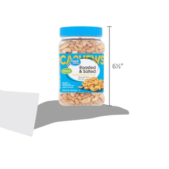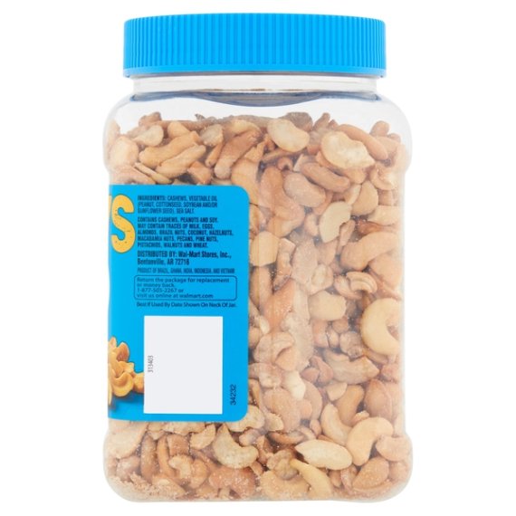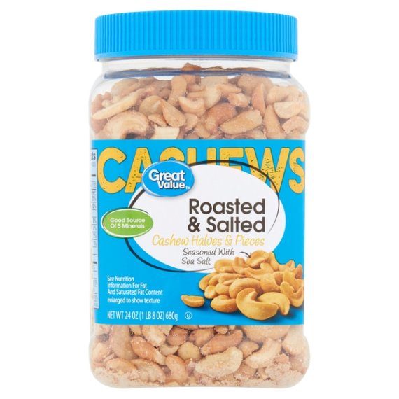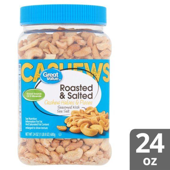 Details Ingredients CASHEWS, VEGETABLE OIL (PEANUT, COTTONSEED, SOYBEAN AND/OR SUNFLOWER SEED), SEA SALT. Product features Grab Great Value Roasted & Salted Cashew Halves & Pieces for a delicious snack that the whole family can enjoy. A good source of 5 minerals and low in carbohydrates and sugar, our roasted cashews are lightly seasoned with real sea salt for a highly snackable protein-packed treat. Mild and satisfying, these cashews can be used to enhance a variety of meals. Add crunch and protein to salads, make homemade trail mix by adding raisins and chocolate, or serve alongside dried fruit and brie cheese as an easy appetizer. Make your own homemade chunky cashew butter as an after-school project with kids. What's more, Great Value Roasted & Salted Cashew Halves & Pieces comes with an easy screw top lid, making them a convenient choice for the family on-the-go. Great Value products provide families with affordable, high quality grocery and household consumable options. With our wide range of product categories spanning grocery and household consumables, we offer you a variety of products for your family's needs. Our products are conveniently available online and in Walmart stores nationwide, allowing you to stock up and save money at the same time. Good source of 5 minerals Cashew halves and pieces seasoned with sea salt Low in carbohydrates Good source of protein Convenient screw top lid Delicious snack Special Features Great for you Net Quantity of Content 24 X 1 oz