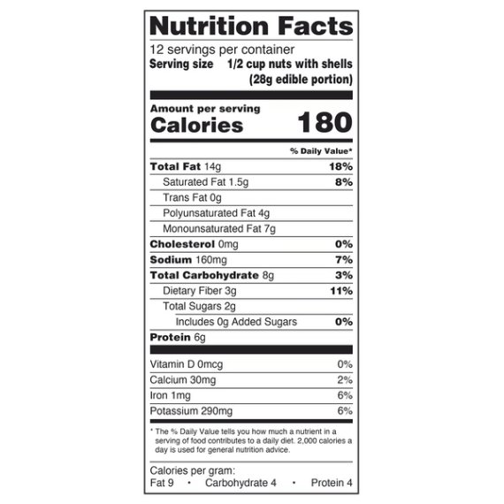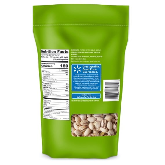 Details Ingredients INGREDIENTS: DRY ROASTED PISTACHIOS, SALT. Product features Get ready for a delicious and nutritious snack with Great Value Roasted & Salted Pistachios. These nuts are grown in California and then roasted and salted to create an unparalleled taste. The shells are slightly open, so it's easy to crack them apart, whether you’re on a road trip, at a ball game, or hiking along trails. Each serving is packed full dietary fiber and other essential nutrients with no cholesterol or trans-fat to keep you fueled throughout the day. Each package contains 24 ounces, so you’ll have quite the stash of ‘stachios. Pick up a bag of Great Value Roasted & Salted Pistachios. Great Value products provide families with affordable, high-quality grocery and household consumable options. With our wide range of product categories spanning grocery and household consumables, we offer you a variety of products for your family's needs. Our products are conveniently available online and in Walmart stores nationwide, allowing you to stock up and save money at the same time. Great Value Roasted & Salted Pistachios, 24 oz: Roasted and salted for a delicious flavor profile High in dietary fiber 24 oz per package Zero cholesterol and trans-fat Highly nutritious High-quality ingredients Net Quantity of Content 12 X 0.5 cup