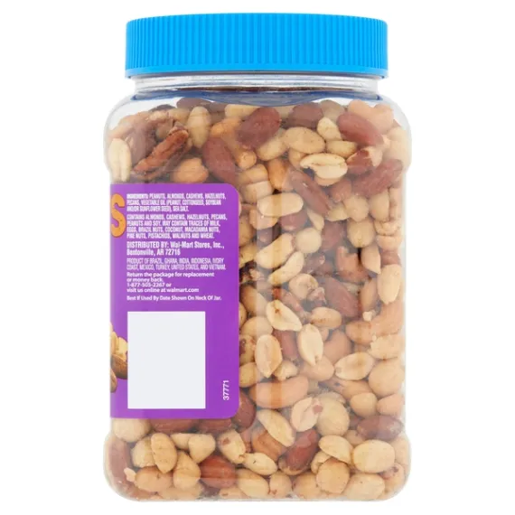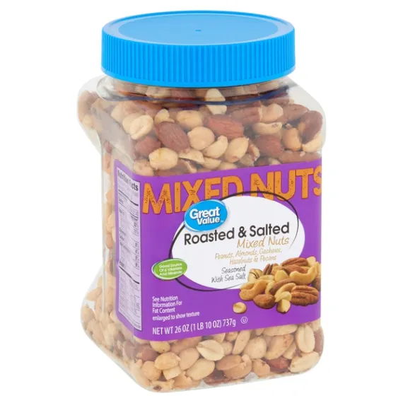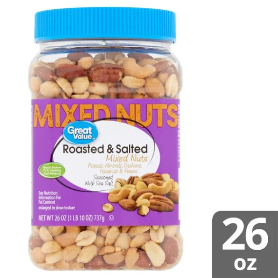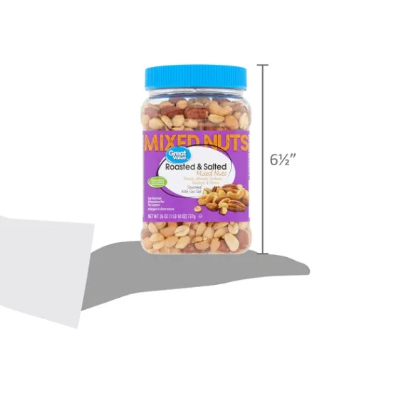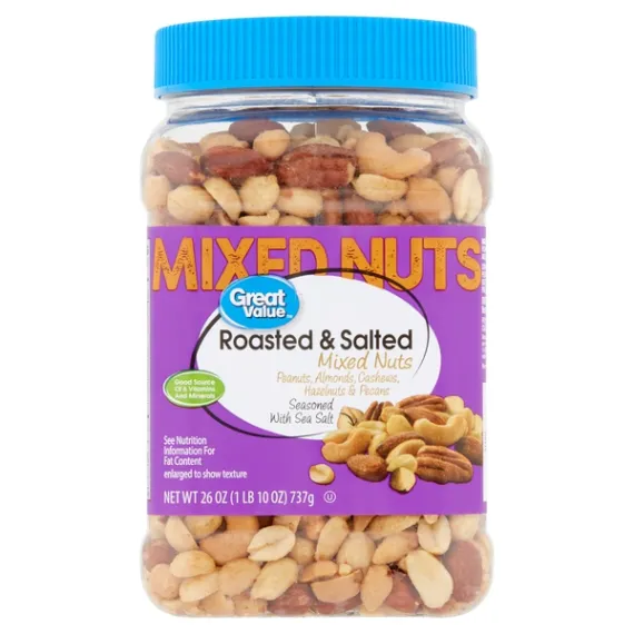 Details Ingredients PEANUTS, ALMONDS, CASHEWS, HAZELNUTS, PECANS, VEGETABLE OIL (PEANUT, COTTONSEED, SOYBEAN AND/OR SUNFLOWER SEED), SEA SALT. Show more Product features Great Value Roasted and Salted Mixed Nuts are an irresistible mix of high-quality, roasted peanuts, almonds, cashews, hazelnuts and pecans whose standard is delicious! These wholesome nuts are seasoned with sea salt that adds a savory twist to your favorite snack. They are a good source of six vitamins and minerals, and make an excellent addition to your daily routine. Great Value Roasted and Salted Mixed Nuts are chosen for nut eaters seeking a perfect blend of sumptuous roasted and salted mixed nuts. They are great for snacking and can also be used to enhance the texture and flavor of your salads and baked goods such as cakes, pies, and cookies. They can also be used in your favorite trail mix and are great for topping on cereals, milkshakes and smoothies. Available in a convenient 26 ounce resealable canister, they are excellent for on-the-go. When you're looking for a savory snack that is packed with protein, grab a handful of Great Value Roasted & Lightly Mixed NutsGreat Value products provide families with affordable, high quality grocery and household consumable options. With our wide range of product categories spanning grocery and household consumables, we offer you a variety of products for your family's needs. Our products are conveniently available online and in Walmart stores nationwide, allowing you to stock up and save money at the same time. 26oz resealable containerRoasted and saltedHigh in proteinVitamins and minerals Net Quantity of Content 26 X 1 oz