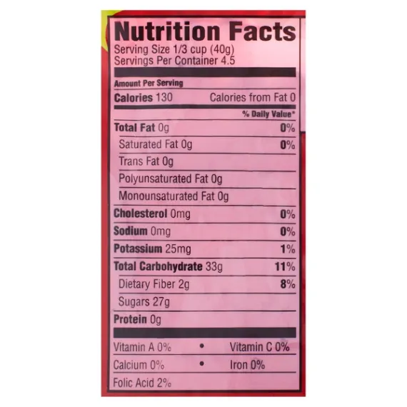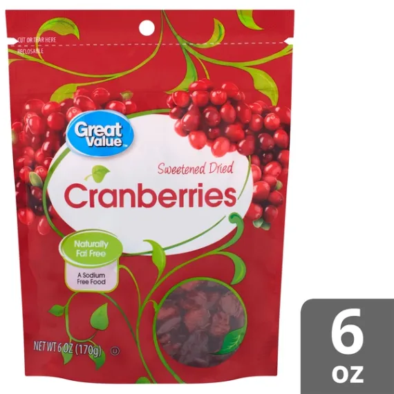 Details Ingredients CRANBERRIES, SUGAR, SUNFLOWER OIL*. Product features Delight in the sweetness and tanginess of our Great Value Dried Cranberries. These delicious dried cranberries are high in fiber, low in sodium, and free of fat, cholesterol, and gluten. They add a colorful and tasty touch to baked goods and recipes. Sprinkle them in your salad or trail mix or just grab a handful. Our berries are the perfect snack for hard-working athletes or fast-growing kids. The resealable bag, which locks in freshness for optimal flavor, contains six servings. Nourish your body with nutrient-filled energy and treat your taste buds to bursts of flavor with Great Value Sweetened Dried Cranberries. Great Value products provide families with affordable, high quality grocery and household consumable options. With our wide range of product categories spanning grocery and household consumables, we offer you a variety of products for your family's needs. Our products are conveniently available online and in Walmart stores nationwide, allowing you to stock up and save money at the same time. 6oz dried cranberries Reclosable stay-fresh bag Kosher Fat-free Sodium-free Nutrient-rich Special Features Yes Net Quantity of Content ABOUT 1.5 X 0.33 cup