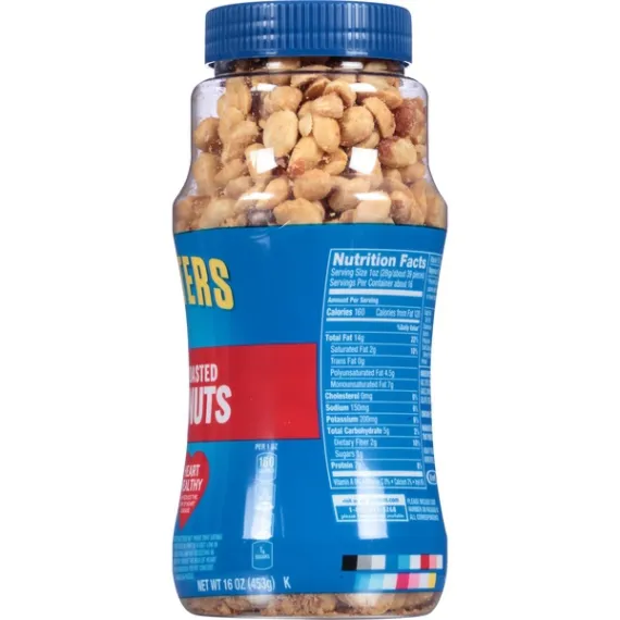 Details Ingredients Ingredients: Peanuts, Contains 2% Or Less Of: Sea Salt, Spices (Contains Celery), Dried Onion, Dried Garlic, Paprika, Natural Flavor, Sugar, Gelatin, Torula Yeast, Cornstarch, Dried Corn Syrup, Maltodextrin. Show more Product features Planters Dry Roasted Peanuts are there for you in crunch time, satisfying your cravings with irresistible flavor. Every batch of these peanuts are dry roasted to perfection, then seasoned with salt to bring out the nutty flavor. These salted peanuts make for a delicious snack that helps fill you up and keep you going. Because every serving is cholesterol-free and Kosher-friendly, these dry roast peanuts are great for sharing with family and friends. Take this 16 ounce jar of dry roasted nuts on your next open-road adventure, or bring the large jar to work for convenient munching or an easy snack. One 16 oz. jar of Planters Dry Roasted Peanuts Planters Dry Roasted Peanuts quell cravings with satisfying crunch Dry roasted peanuts seasoned with salt for irresistible flavor 7 grams of protein per 1 oz. serving Cholesterol-free and trans fat-free with 14 g. of fat per serving 160 calories in each 1 oz. serving Easy-to-open packaging for convenient snacking Special Features Dry roasted Net Quantity of Content 16.0 X 1oz (28g/about 39 pieces)