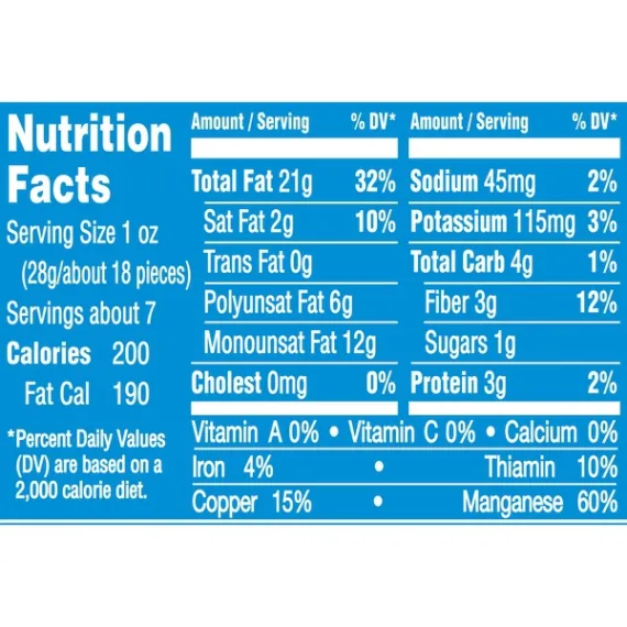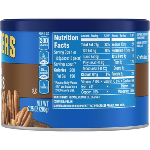 Details Ingredients Ingredients: Pecans, Peanut Oil, Sea Salt. Product features Planters Roasted Pecans have a rich taste and a satisfying crunch, making them perfect for snacking or adding to homemade bread and desserts. Roasted in peanut oil and seasoned with just the right amount of salt, these culinary nuts are a mainstay for your pantry or kitchen cupboard. You get nutritious energy at 200 calories per 1 Ounce. serving, which helps curb between-meal hunger or fulfills any late-night salty-snack cravings that may arise. Packed in a 7.25 Ounce. can with a resealable lid that keeps the whole pecans fresh and easy to grab, these premium-quality Kosher nuts are sourced from Mexico and the USA. Enrich your favorite cookie or muffin recipes with these buttery roasted nuts, or keep a can of pecans handy for snacking while you're watching a game or your favorite TV show. One 7.25 Ounce. can of Planters Roasted Pecans Planters Roasted Pecans deliver a rich taste that satisfies Airtight can with a resealable lid keeps whole pecans fresh Roasted in peanut oil to crispy perfection Seasoned with salt for great flavor Special Features Resealable Canister Net Quantity of Content 7.0 X 1oz (28g / about 18 pieces)
