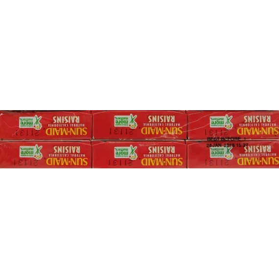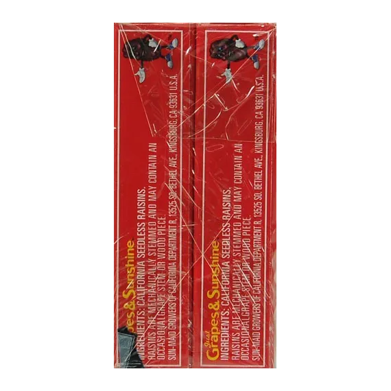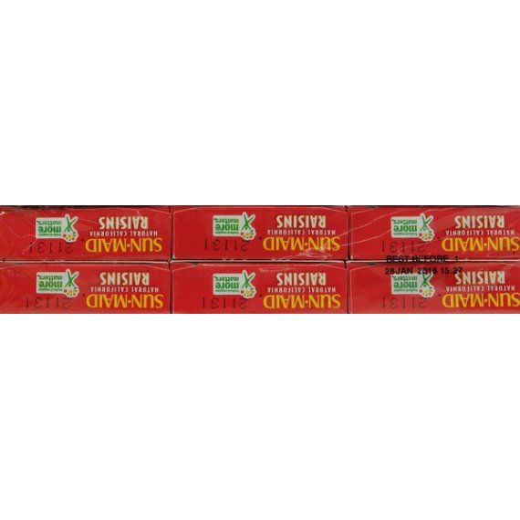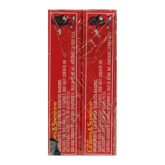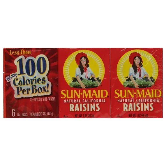 Details Ingredients California Seedless Raisins. Product features Sun-Maid Natural California Raisins are America’s favorite healthy and convenient snack. Made with whole fruit and no added sugar, this anytime anywhere snack is perfect for kids and adults alike. Sun-Maid raisins are ripened by the sun to the peak of flavor, then sun dried to perfection. Packed with fiber, these raisins are a healthy addition to your diet. For years, Sun-Maid has been dedicated to provide families delicious and healthy snacks. Sweeten your favorite dessert or add them to your favorite trail mix recipe. A perfect addition to your lunch pail, purse, or snack drawer. Close your eyes and feel the sun with Sun-Maid. 100% Fruit No Sugar Added Snack Sized Portions Packed with fiber Healthy snack for home, school, work and all stops in between Special Features 100% real fruit Net Quantity of Content 6 X 28.3 G