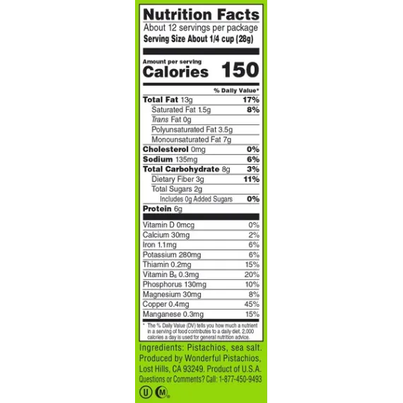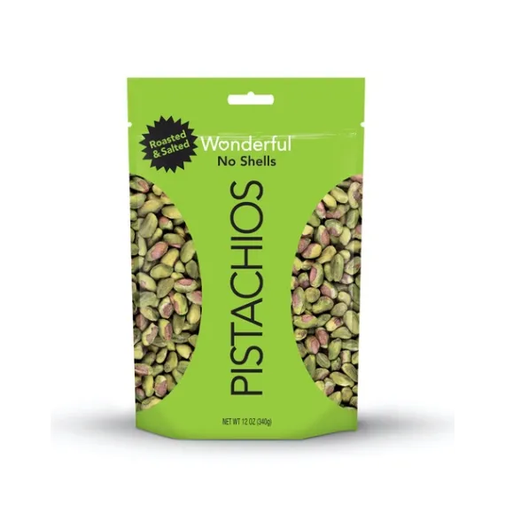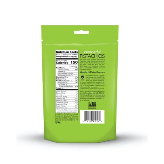 Details Ingredients Pistachios, Sea Salt. Product features 12 Ounces of our Wonderful Pistachios without the Shell. Roasted and Salted Wonderful Pistachios have literally come out of their shells. Same delicious taste, but with a little less work for you. Still great for snacking, they’re also a wonderful addition to your culinary creations. One 12 Ounce Resealable Pouch of our Roasted & Salted No Shells Wonderful Pistachios.These Wonderful Pistachios have come out of their shells. We do the crackin’, you do the snackin’.Gluten FreeNon-GMO Project VerifiedKosher CertifiedHalal CertifiedTHE FIT NUT: Fuel your fitness with The Fit Nut. They’re tasty little powerhouses of heart-healthy goodness.THE SKINNY NUT: Go ahead and indulge a little with The Skinny Nut. Known for fiber and protein, pistachios are deliciously fulfilling.THE MINDFUL NUT: Savor each moment with The Mindful Nut. Crack, relax and snack mindfully. Ohmmm.THE COLORFUL NUT: Add some color to your diet with The Colorful Nut. Fun fact: their green and red-purple hues come from vibrant antioxidants.THE HAPPY NUT: Go snack-happy with The Happy Nut. Once you crack one open, you’re sure to crack a smile. Net Quantity of Content 11 X About 0.25 cup