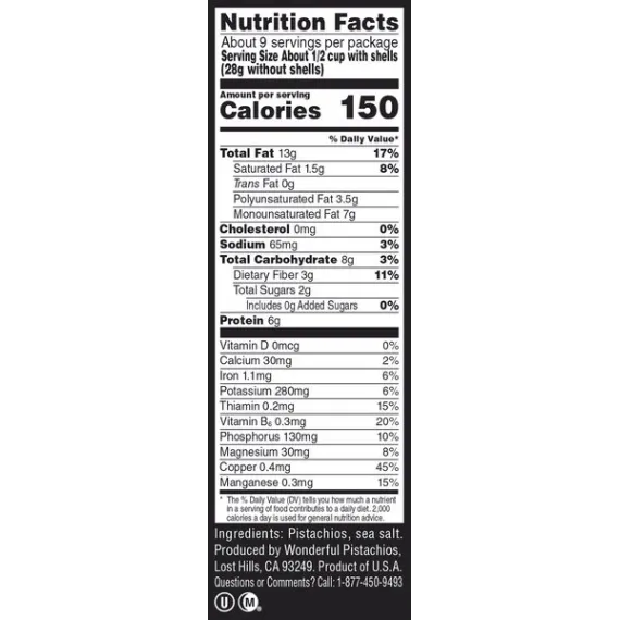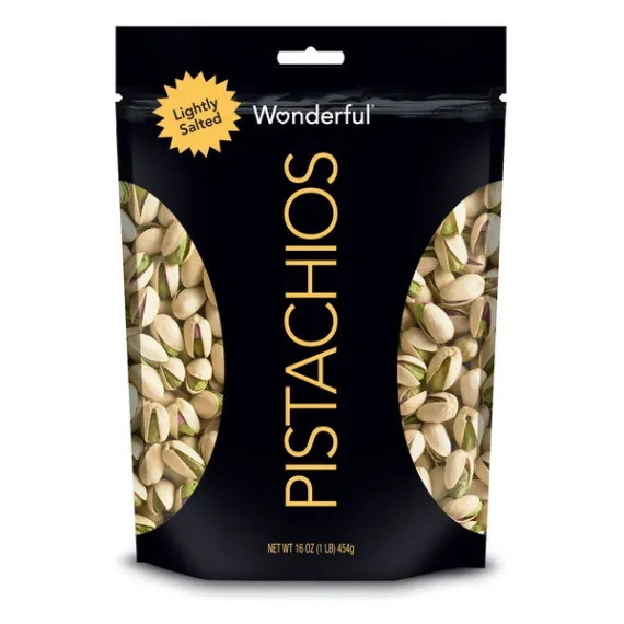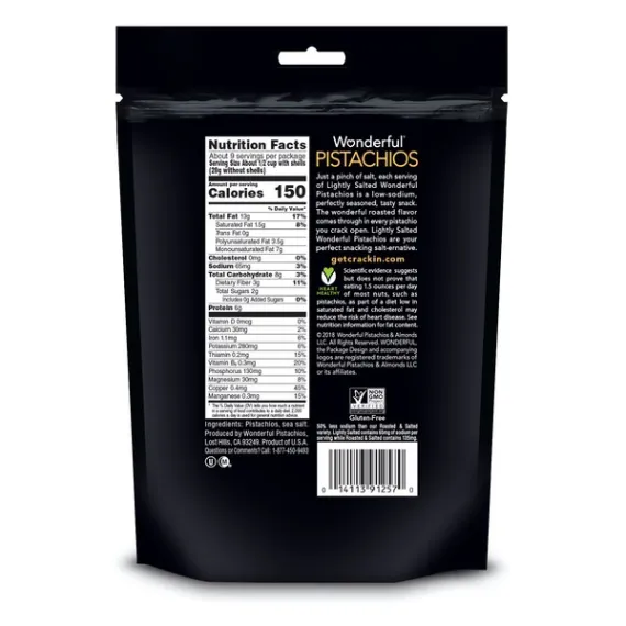 Details Ingredients Pistachios, Sea Salt Product features 16 Ounces of our Roasted & Lightly Salted Wonderful Pistachios. Just a pinch of salt, each serving of Lightly Salted Wonderful Pistachios is a low-sodium, perfectly seasoned, tasty snack. The wonderful roasted flavor comes through in every pistachio you crack open. Lightly Salted Wonderful Pistachios are your perfect snacking salt-ernative. Wonderful Pistachios are a smart, healthy choice for folks around the world. Located in Californiaâs fertile San Joaquin Valley, Wonderful Pistachios & Almonds owns, cultivates and harvests more than 75,000 acres of pistachio and almond orchards, and delivers pounds of nuts globally each year. The warm days and cool nights work in harmony with the regionâs natural soils to create the perfect growing climate. We then carefully tend and harvest each pistachio using the latest in sustainable practices. One 16 Ounce Resealable Pouch of our Roasted & Lightly Salted In-Shell Wonderful Pistachios.Just a pinch of salt, each serving of Lightly Salted Wonderful Pistachios is a low-sodium, perfectly seasoned, tasty snack. The wonderful roasted flavor comes through in every pistachio you crack open. Lightly Salted Wonderful Pistachios are your perfect snacking salt-ernative.Gluten FreeNon-GMO Project VerifiedKosher CertifiedHalal Certified Net Quantity of Content 8 X 30.0