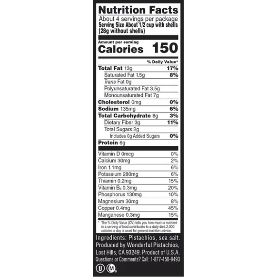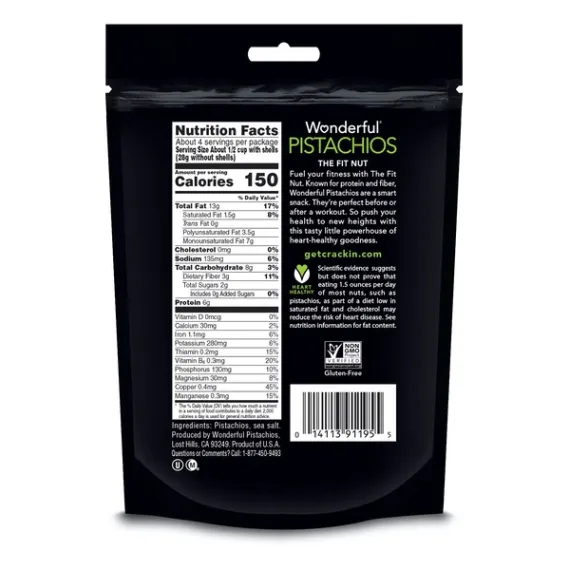 Details Ingredients PISTACHIOS, SEA SALT. Product features One 8 Ounce Resealable Pouch of our Roasted & Salted In-Shell Wonderful Pistachios. Wonderful Pistachios are a smart, healthy choice for folks around the world. Located in Californiaâs fertile San Joaquin Valley, Wonderful Pistachios & Almonds owns, cultivates and harvests more than 75,000 acres of pistachio and almond orchards, and delivers pounds of nuts globally each year. The warm days and cool nights work in harmony with the regionâs natural soils to create the perfect growing climate. We then carefully tend and harvest each pistachio using the latest in sustainable practices. One 8 Ounce Resealable Pouch of our Roasted & Salted In-Shell Wonderful PistachiosGluten FreeNon-GMO Project VerifiedKosher CertifiedHalal CertifiedTHE FIT NUT: Fuel your fitness with The Fit Nut. They’re tasty little powerhouses of heart-healthy goodness.THE SKINNY NUT: Go ahead and indulge a little with The Skinny Nut. Known for fiber and protein, pistachios are deliciously fulfilling.THE MINDFUL NUT: Savor each moment with The Mindful Nut. Crack, relax and snack mindfully. Ohmmm.THE COLORFUL NUT: Add some color to your diet with The Colorful Nut. Fun fact: their green and red-purple hues come from vibrant antioxidants.THE HAPPY NUT: Go snack-happy with The Happy Nut. Once you crack one open, you’re sure to crack a smile. Special Features Heart healthy Net Quantity of Content ABOUT 4 X 1/2 cup