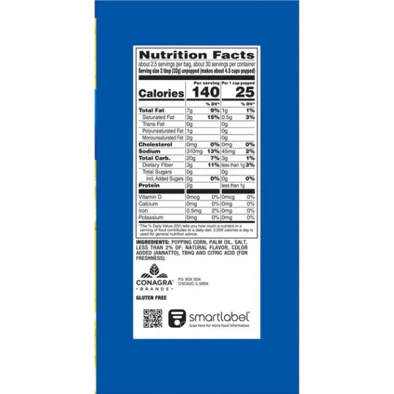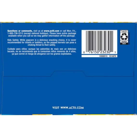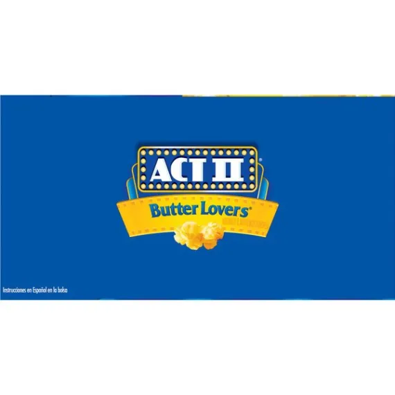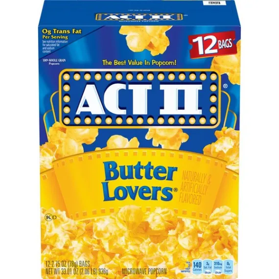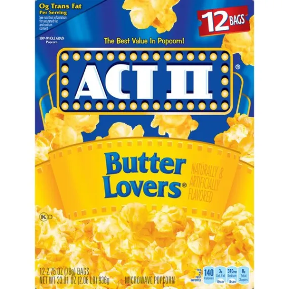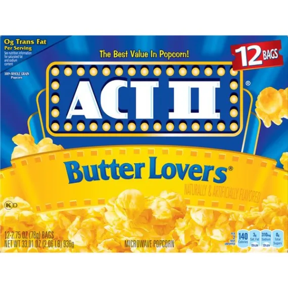 Details Ingredients Popping Corn, Palm Oil, Salt, Less than 2% of: Natural Flavor, Color Added (Annatto), TBHQ and Citric Acid (for freshness). Product features ACT II Popcorn adds whole grain and fiber to your diet while satisfying your popcorn craving. Pops up in minutes and is packed with flavor. ACT II Butter Lovers Popcorn is perfect for those who truly appreciate butter on their popcorn. ACT II is the best value in popcorn. From family favorites to sweet and savory options, ACT II's variety of flavors ensure there's a popcorn flavor everyone will love. Contains twelve 2.75 ounce bags of ACT II Butter Lovers Microwave PopcornEven more of the buttery taste you loveThe best value in popcornGreat midday snack0 g trans fat per serving100% whole grain140 calories per serving Net Quantity of Content 29.0 X 32g