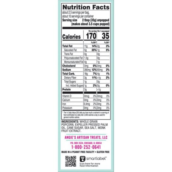 Details Ingredients Whole Grain Popcorn, Expeller Pressed Palm Oil, Cane Sugar, Sea Salt, Monk Fruit Extract. Product features Imagine you're at the state fair and dig in to Angie's BoomChickaPop Lightly Sweet Kettle Corn Microwave Popcorn. With real, simple ingredients (nothing fake!), 35 calories per cup popped, and 0 g trans fat per serving, you can enjoy the delicious hint of sweet flavor without any guilt. Plus, it's whole grain, non-GMO, and gluten free. Just pop our fresh-pop bowl in the microwave, then open right up for a convenient snack that's ready for you to grab right out of the bowl. Midday munchies and movie nights will never be the same. Now, get out there and crush it. (4) 3.29 oz. fresh-pop bowls of Angie's BoomChickaPop Lightly Sweet Kettle Corn Microwave PopcornEnjoy the perfect hint of sweet with Angie's BoomChickaPop Lightly Sweet Kettle Corn Microwave PopcornPops up in the microwave in a convenient fresh-pop bowl, so your snack is easy to grab and enjoy without any extra dishes35 calories per cup popped and 0 g trans fat per serving for a snack without all the guiltWhole grain, non-GMO, and gluten freeThe perfect snack for movie night, for curing the midday munchies, or for any timeYou can feel good about enjoying this popcorn—or about sharing it with your family Net Quantity of Content 11.0 X 35g