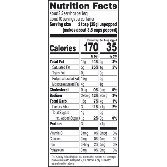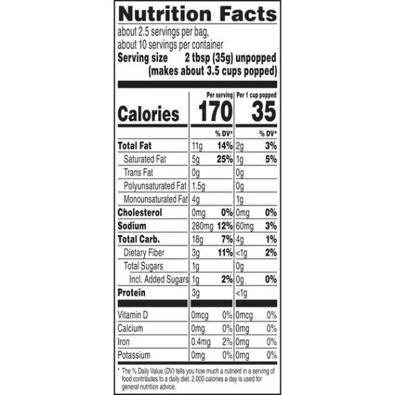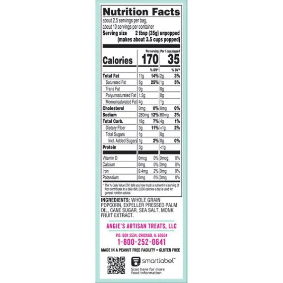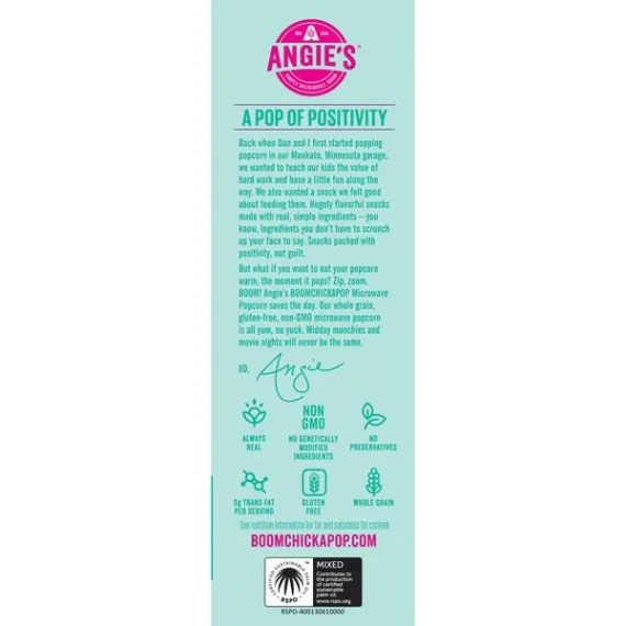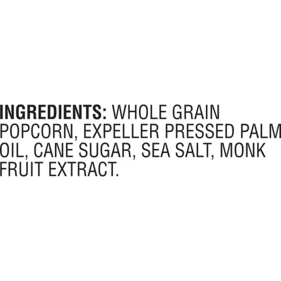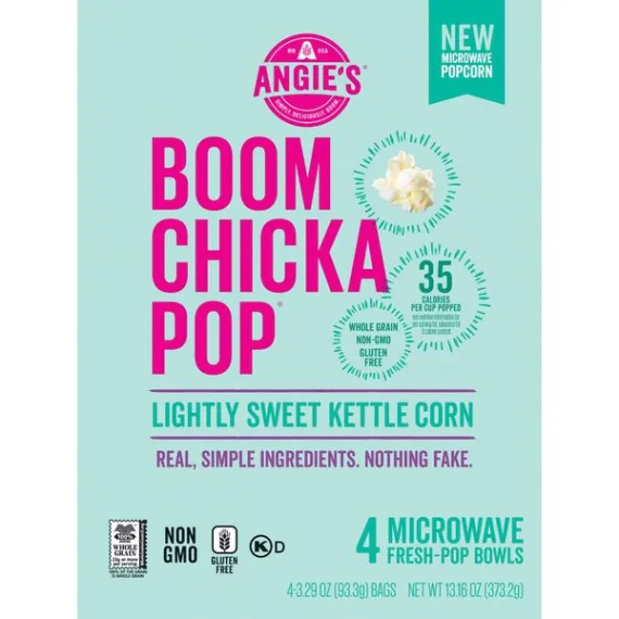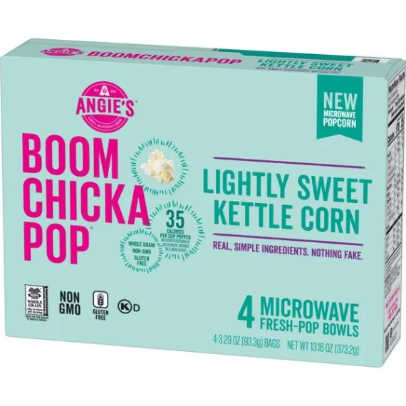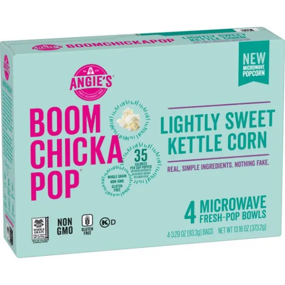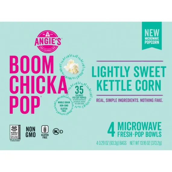 Details Ingredients Whole Grain Popcorn, Expeller Pressed Palm Oil, Cane Sugar, Sea Salt, Monk Fruit Extract. Product features Imagine you're at the state fair and dig in to Angie's BoomChickaPop Lightly Sweet Kettle Corn Microwave Popcorn. With real, simple ingredients (nothing fake!), 35 calories per cup popped, and 0 g trans fat per serving, you can enjoy the delicious hint of sweet flavor without any guilt. Plus, it's whole grain, non-GMO, and gluten free. Just pop our fresh-pop bowl in the microwave, then open right up for a convenient snack that's ready for you to grab right out of the bowl. Midday munchies and movie nights will never be the same. Now, get out there and crush it. (4) 3.29 oz. fresh-pop bowls of Angie's BoomChickaPop Lightly Sweet Kettle Corn Microwave PopcornEnjoy the perfect hint of sweet with Angie's BoomChickaPop Lightly Sweet Kettle Corn Microwave PopcornPops up in the microwave in a convenient fresh-pop bowl, so your snack is easy to grab and enjoy without any extra dishes35 calories per cup popped and 0 g trans fat per serving for a snack without all the guiltWhole grain, non-GMO, and gluten freeThe perfect snack for movie night, for curing the midday munchies, or for any timeYou can feel good about enjoying this popcorn—or about sharing it with your family Net Quantity of Content 11.0 X 35g
