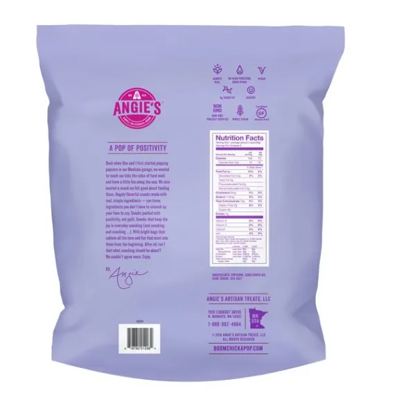 Details Ingredients Popcorn, Sunflower Oil, Cane Sugar, Sea Salt. Product features Like your favorite treat at the county fair, each 1-ounce bag of Angie's BOOMCHICKAPOP Sweet & Salty Kettle Corn Popcorn is packed with flavor. Enjoy this whole-grain, non-GMO popcorn as a vegan, gluten-free snack that's made with real, simple ingredients. This salty and sweet kettle corn has 140 calories per bag and 0 grams trans fat per serving. Each bag of popcorn has delicious, pre-popped kettle corn that's ready to eat right out of the bag. Keep this flavored popcorn on hand for road trips, office parties, after-school snacks, movie nights and other joyful snacking occasions. Stock your pantry with a 6-count pack of Angie's BOOMCHICKAPOP Popcorn for a pop of positivity anytime. Contains one 6-count pack with 1-ounce bags of Angie's BOOMCHICKAPOP Sweet & Salty Kettle Corn Popcorn This Angie's BOOMCHICKAPOP Popcorn is made with real, simple ingredients, including real cane sugar and sea salt Grab a bag for an easy, salty-sweet snack that's pre-popped and ready to eat This kettle corn has 140 calories per bag of popcorn and 0 grams trans fat per serving Stock up on this vegan, gluten-free snack that's made with non-GMO, whole-grain popcorn Net Quantity of Content 6 X 28g