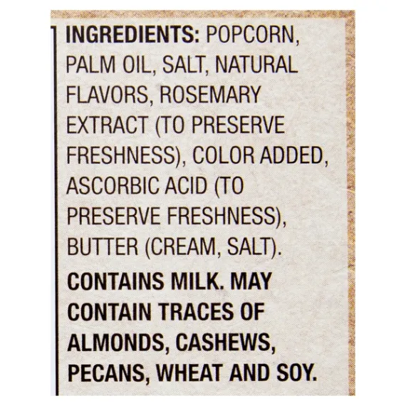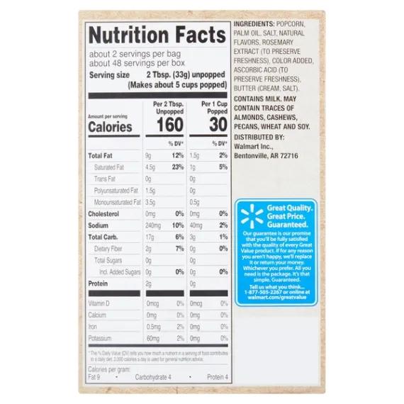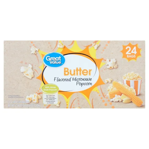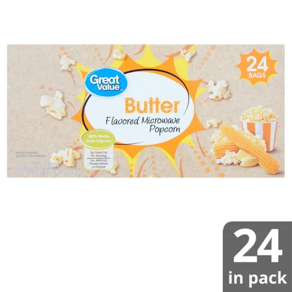 Details Ingredients Popcorn, Palm Oil, Salt, Natural Flavors, Rosemary Extract (to preserve freshness), Color Added, Ascorbic Acid (to preserve freshness), Butter (Cream, Salt) Show more Product features The deliciously buttery flavor of Great Value Butter Flavored Microwave Popcorn will keep you coming back for more. Bring the movie theater home with this snacking classic. Hot from the microwave in minutes with the perfect balance of butter flavor and salt, it is irresistible to popcorn lovers everywhere. Our popcorn is made with 100% whole grain with no artificial flavors or preservatives for a high-quality family treat. Not just great tasting, it is cholesterol free, gluten-free, and high in fiber. The perfect savory snack to make every night a movie night, this microwave popcorn is also a wise choice for school, work, or on the go. There are 24 bags that are easy to prepare and easy to enjoy. Our airy popcorn melts in your mouth. Treat yourself and your family to popcorn perfection with Great Value Butter Flavored Microwave Popcorn.Great Value products provide families with affordable, high quality grocery and household consumable options. With our wide range of product categories spanning grocery and household consumables, we offer you a variety of products for your family's needs. Our products are conveniently available online and in Walmart stores nationwide, allowing you to stock up and save money at the same time. Delicious butter flavorHigh-quality family treat100% whole grain popcornMicrowave in minutesCholesterol and gluten-freeNo artificial flavors or preservatives Net Quantity of Content 48 X 2 Tbsp. (33g) unpopped (Makes about 5 cups popped)