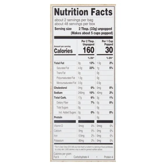 2 Tbsp. (33g) unpopped (Makes about 5 cups popped)