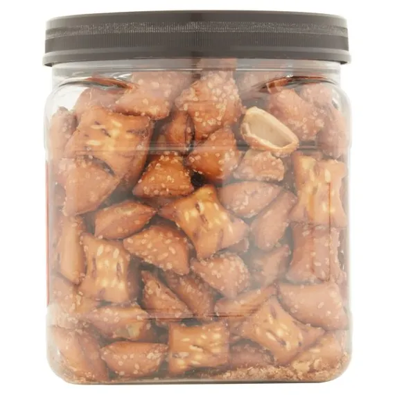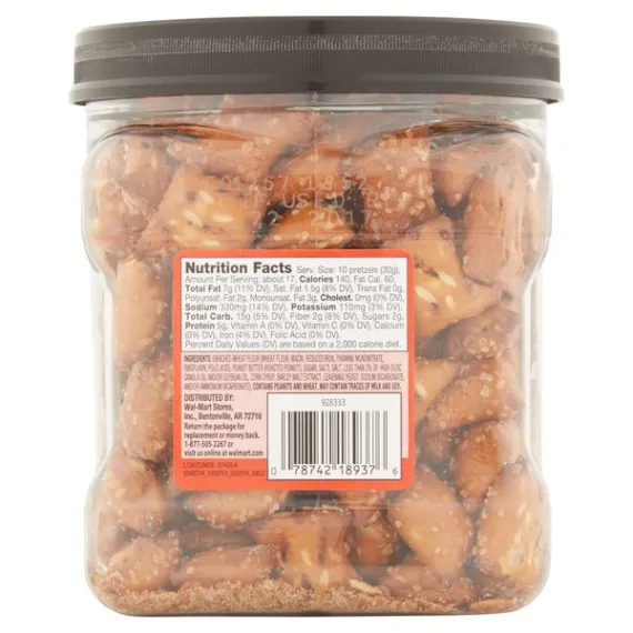 Details Ingredients Enriched Wheat Flour (Wheat Flour, Niacin, Reduced Iron, Thiamine Mononitrate, Riboflavin, Folic Acid), Peanut Butter (Roasted Peanuts, Sugar, Salt), Salt Less than 2% or: High Oleic Canola Oil and/or Soybean Oil, Corn Syrup. Barley Malt Extract, Leavening (Yeast, Sodium Bicarbonate, and/or Ammonium Bicarbonate). Show more Product features Great Value Peanut Butter Filled Pretzel Nuggets are the tasty snack your mouth is looking for. These pretzel nuggets are filled with real peanut butter for a crunchy and nutty taste in every bite. Each serving is filled with protein, and has 0 g of trans fat so you can enjoy a nutritious snack without worrying. Great Value Peanut Butter Filled Nuggets come in a container with a screw top so they're easy to enjoy at home, at school, at the office or on the go. Look forward to snack time with Great Value Peanut Butter Filled Pretzel Nuggets.Great Value products provide families with affordable, high quality grocery and household consumable options. With our wide range of product categories spanning grocery and household consumables, we offer you a variety of products for your family's needs. Our products are conveniently available online and in Walmart stores nationwide, allowing you to stock up and save money at the same time. Great Value Peanut Butter Filled Pretzel Nuggets, 18 ozMade with Real Peanut ButterGood source of protein0 g trans fat per servingPerfect snack Net Quantity of Content ABOUT 17 X 30 g