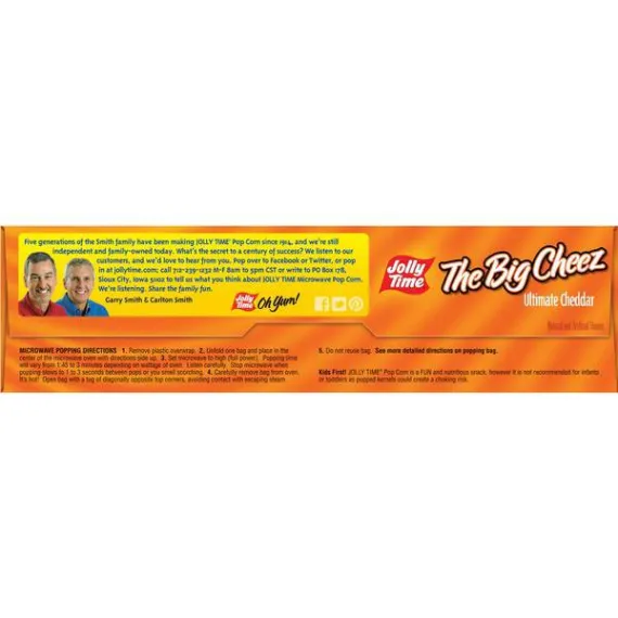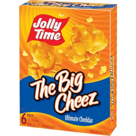 Details Ingredients 100% Whole Grain Non-GMO Pop Corn, Partially Hydrogenated Soybean and/Or Cottonseed Oil, Salt, Natural and Artificial Flavors (Includes: Monosodium Glutamate, Autolyzed Yeast Extract, Disodium Inosinate, Disodium Guanylate), Spice and Coloring Added, Soy Lecithin. Show more Product features If you're into cheese, this popcorn's a cut above. Jolly Time The Big Cheez Ultimate Cheddar Microwave Popcorn is the ultimate cheese microwave pop corn, with larger-than-life, full-out cheddar cheese flavor. Every bite is loaded with a melt-in-your-mouth burst of rich, over-the-top taste. It's extremely delicious. You want big taste? Get The Big Cheez. Jolly Time The Big Cheez Ultimate Cheddar Microwave Popcorn:Rich and savory gourmet cheddar cheese flavor microwave popcornSharableWhole grain0 cholesterolNon-GMO kernels Net Quantity of Content 9.5 X 1 Cup