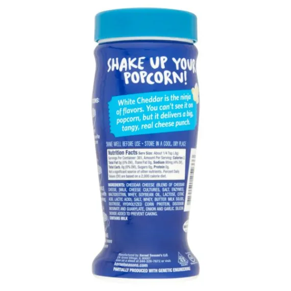 Details Ingredients Cheddar Cheese (Blend of Cheddar Cheese, [Milk, Cheese Cultures, Salt, Enzymes], Maltodextrin, Whey, Soybean Oil, Lactose, Citric Acid, Lactic Acid), Salt, Whey, Butter Milk Solids, Dextrose, Hydrolyzed Corn Protein, Disodium Inosinate and Guanylate, Onion and Garlic. Silicon Dioxide added to prevent caking. Show more Product features White Cheddar is the ninja of flavors. You can’t see it on popcorn, but it delivers a big, tangy real cheese punch. This low calorie flavor powerhouse is also the perfect addition to steamed veggies, chicken and potatoes. Kernel Season's White Cheddar Popcorn Seasoning. About the Product · Shake up your popcorn with our big, tangy, real cheese White Cheddar seasoning · With only 2 calories per serving Kernel Season’s popcorn seasonings are an easy and low calorie way to shake up the flavor of your favorite snack, veggies and pasta · 100 servings per jar, ¼ tsp per serving · Certified Gluten Free and Kosher· Proudly made in the US Net Quantity of Content 300 X 0.25 tsp.