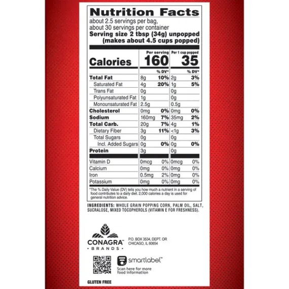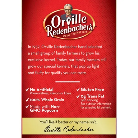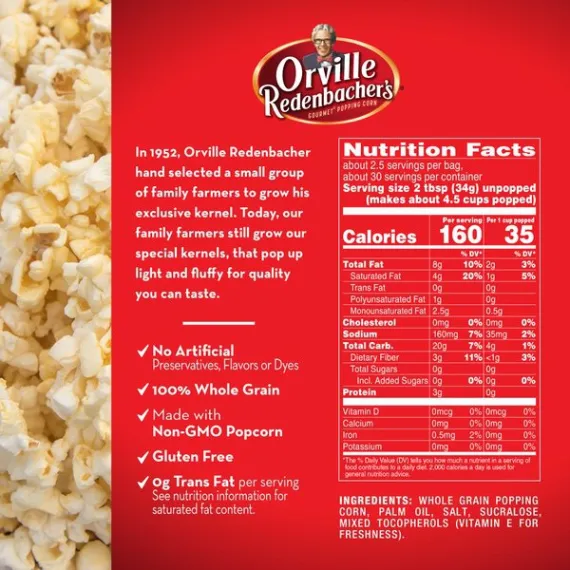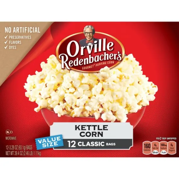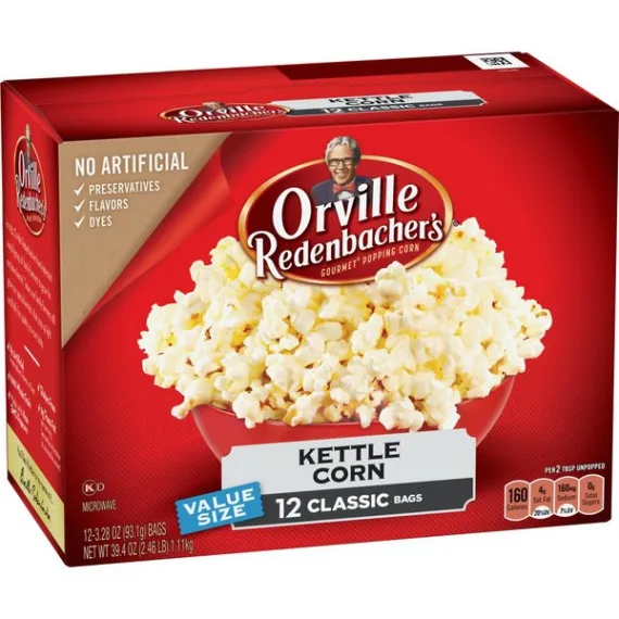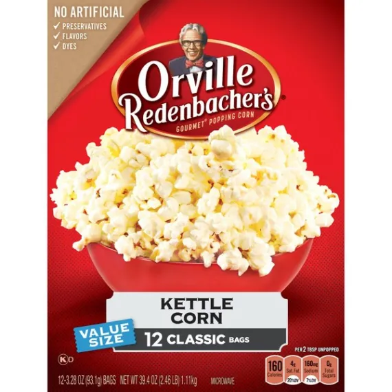 Details Ingredients Whole Grain Popping Corn, Palm Oil, Salt, Sucralose, Mixed Tocopherols (Vitamin E for freshness). Product features Orville Redenbacher's Kettle Corn kernels are a little bit salty, a little bit sweet, and a whole lot of yummy. Enjoy the delicious flavor that will transport your taste buds to the state fair. Orville Redenbacher's is the only leading brand of microwave popcorn with no artificial preservatives, flavors, or dyes in all of our products, and our 100% whole grain popcorn is made with high-quality, non-GMO kernels. Orville Redenbacher's isn't just a name-it comes with a promise of excellence and authenticity. This microwave popcorn is a family-favorite snack with 160 calories per serving. Add our Kettle Corn flavor to your family's popcorn kit for a flavorful twist on a favorite snack. Contains (12) 3.28 oz. classic bags of Orville Redenbacher's Kettle Corn Microwave PopcornGrab your favorite popcorn bucket, and enjoy the salty and sweet snack that tastes like the state fair in popcorn formOrville Redenbacher's is the only leading brand of microwave popcorn with no artificial preservatives, flavors, or dyes in all of our productsIn 1952, Orville Redenbacher hand selected a small group of farmers to grow his exclusive kernel, and our family farmers still grow our special kernels todayAdd these microwaveable, gluten-free popcorn packs to your pantry for a flavorful twist on your family's favorite snack Net Quantity of Content 33.0 X 34g