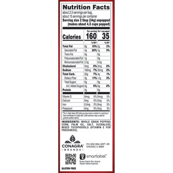 Details Ingredients Whole Grain Popping Corn, Palm Oil, Salt, Sucralose, Mixed Tocopherols (Vitamin E for freshness). Product features Orville Redenbacher's Kettle Corn kernels are a little bit salty, a little bit sweet, and a whole lot of yummy. Enjoy the delicious flavor that will transport your taste buds to the state fair. Orville Redenbacher's is the only leading brand of microwave popcorn with no artificial preservatives, flavors, or dyes in all of our products, and our 100% whole grain popcorn is made with high-quality, non-GMO kernels. Orville Redenbacher's isn't just a name-it comes with a promise of excellence and authenticity. This microwave popcorn is a family-favorite snack with 160 calories per serving. Add our Kettle Corn flavor to your family's popcorn kit for a flavorful twist on a favorite snack. Contains (6) 3.28 oz. classic bags of Orville Redenbacher's Kettle Corn Microwave PopcornGrab your favorite popcorn bucket, and enjoy the salty and sweet snack that tastes like the state fair in popcorn formOrville Redenbacher's is the only leading brand of microwave popcorn with no artificial preservatives, flavors, or dyes in all of our productsIn 1952, Orville Redenbacher hand selected a small group of farmers to grow his exclusive kernel, and our family farmers still grow our special kernels todayAdd these microwaveable, gluten-free popcorn packs to your pantry for a flavorful twist on your family's favorite snack Net Quantity of Content 16.0 X 34g