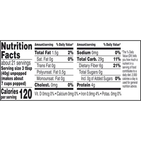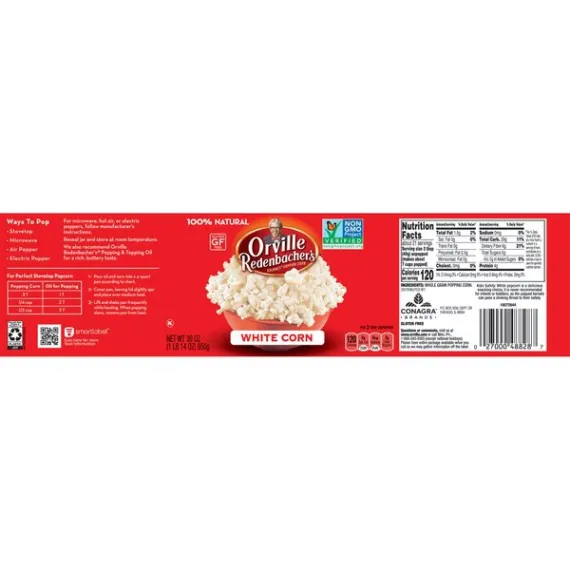 Details Ingredients Whole Grain Popping Corn. Product features Orville Redenbacher's 100% whole grain Original White Gourmet Popping Kernels pop up in a jiffy and are light and fluffy. Grab your hot air popper or stovetop popcorn popper, and make a popcorn snack with high-quality ingredients from our select family farmers. Orville Redenbacher's is the only leading brand of microwave popcorn with no artificial preservatives, flavors, or dyes in all of our products. Our Non-GMO Project Verified popcorn kernels come with a promise of excellence and authenticity. These unpopped, non-GMO kernels belong in your pantry's popcorn kits so you can add a little butter and pretend like you're at the movie theater any time you want. Plus, these natural kernels are the perfect way to add a pop of fun to everyday occasions, like after-school snack time. Contains 30 oz. of Orville Redenbacher's Original White Gourmet Unpopped Popcorn KernelsUse these gourmet Orville Redenbacher's popping kernels with butter-flavored popcorn oil to make popcorn with your hot air popper or stovetop popcorn popperMade with 100% whole grain, these unpopped popcorn kernels pop up light and fluffy-and in a jiffy-for a gourmet popcorn snackIn 1952, Orville Redenbacher hand selected a small group of farmers to grow his exclusive kernel, and our family farmers still grow our special kernels todayThese 100% natural, non-GMO popcorn kernels pop for a delicious treat or gluten-free snack after school Net Quantity of Content 21.0 X 40g