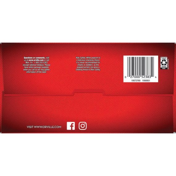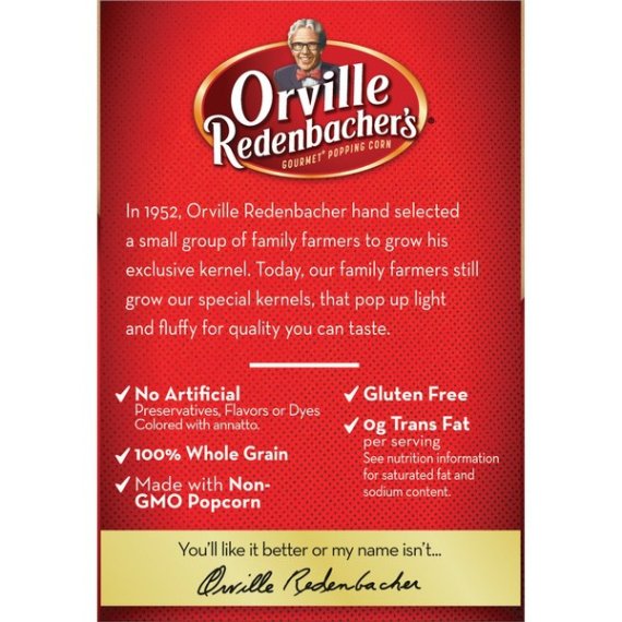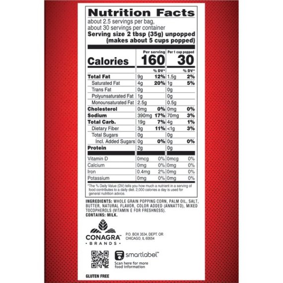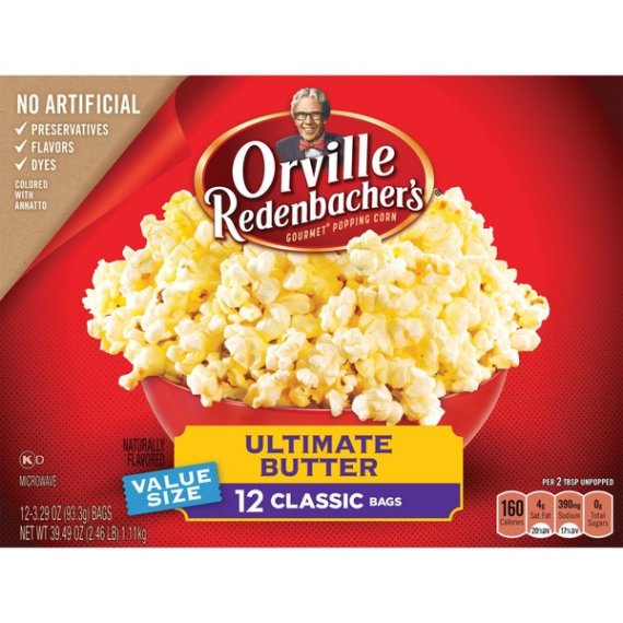 Details Ingredients Whole Grain Popping Corn, Palm Oil, Salt, Butter, Natural Flavor, Color Added (Annatto), Mixed Tocopherols (Vitamin E for freshness). CONTAINS: MILK. Show more Product features Who says you can't rush perfection? Orville Redenbacher’s Ultimate Butter Microwave Popcorn pops up in minutes and is packed with flavor and loads of real butter. Orville Redenbacher’s Ultimate Butter Popcorn has 0 g trans fat and 100% whole-grain gourmet popcorn per serving. But what makes our microwave popcorn so perfect? It's an exclusive kernel hybrid that pops up lighter and fluffier than ordinary popcorn. This, combined with our commitment to quality, makes us the #1 popcorn for families everywhere. Enjoy a delicious snack that’s ready in minutes. Contains twelve (12) Classic Bags of Orville Redenbacher's Ultimate Butter Microwave PopcornMicrowave popcorn packed with delicious flavor and loads of real butterMade from 100% whole grains and is a good source of fiberUltimate Butter Popcorn is a gluten-free snack0 g trans fat per servingOrville Redenbacher's Gourmet Popcorn uses an exclusive kernel hybrid that pops up lighter and fluffier than ordinary popcorn Net Quantity of Content 32.0 X 35g