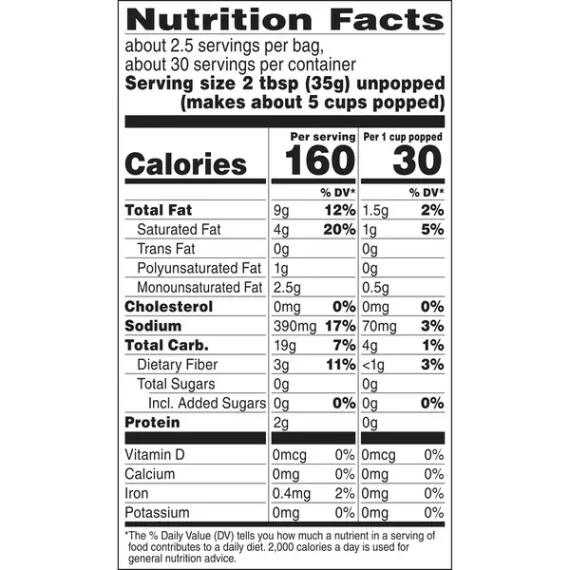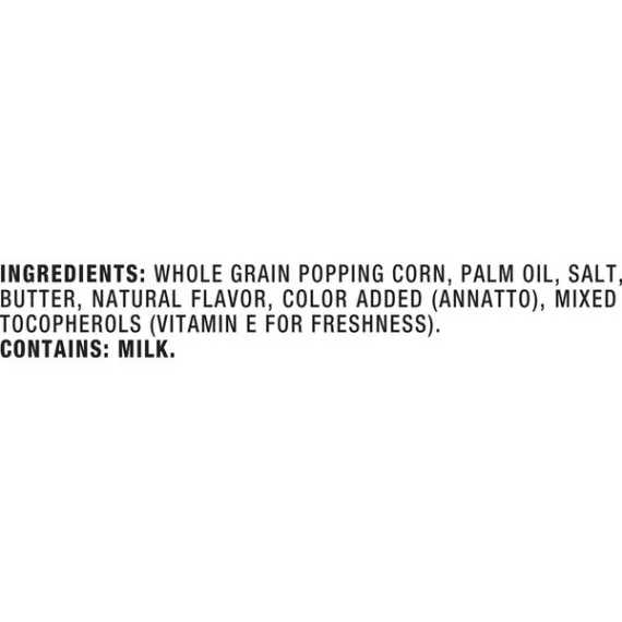 Details Ingredients Whole Grain Popping Corn, Palm Oil, Salt, Butter, Natural Flavor, Color Added (Annatto), Mixed Tocopherols (Vitamin E for freshness). CONTAINS: MILK. Show more Product features Who says you can't rush perfection? Orville Redenbacher’s Ultimate Butter Microwave Popcorn pops up in minutes and is packed with flavor and loads of real butter. Orville Redenbacher’s Ultimate Butter Popcorn has 0 g trans fat and 100% whole-grain gourmet popcorn per serving. But what makes our microwave popcorn so perfect? It's an exclusive kernel hybrid that pops up lighter and fluffier than ordinary popcorn. This, combined with our commitment to quality, makes us the #1 popcorn for families everywhere. Enjoy a delicious snack that’s ready in minutes. Contains twelve (12) Classic Bags of Orville Redenbacher's Ultimate Butter Microwave PopcornMicrowave popcorn packed with delicious flavor and loads of real butterMade from 100% whole grains and is a good source of fiberUltimate Butter Popcorn is a gluten-free snack0 g trans fat per servingOrville Redenbacher's Gourmet Popcorn uses an exclusive kernel hybrid that pops up lighter and fluffier than ordinary popcorn Net Quantity of Content 32.0 X 35g