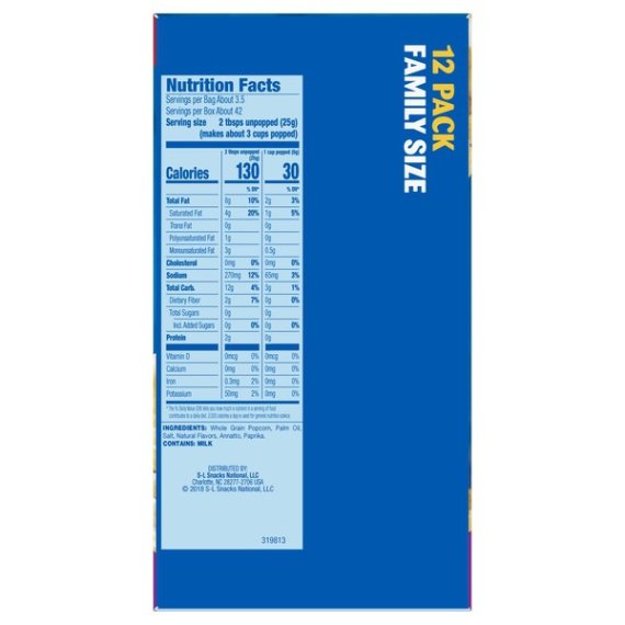 Details Ingredients Whole Grain Popcorn, Palm Oil, Salt, Natural and Artificial Flavor [Milk], Color Added, Freshness Preserved by TBHQ. Product features Pop Secret is your secret to movie night! Bring the movie theater home with this slightly sweeter butter flavor and classic crunch. Microwaveable and easy to serve, every kernel is a delicious burst of taste in your mouth. And it contains no artificial preservatives, flavors, or dyes. Bring the movie theater home with this slightly sweeter butter flavor and classic crunch100% whole grain; Non-GMO corn, 0g trans fat, No sugar addedFamily Size box of 12 microwave popcorn bagsDelicious warm popcorn with an irresistible aroma and flavor, ready in minutesAt Pop Secret, we do butter better! Net Quantity of Content ABOUT 34 X 2 Tbsp