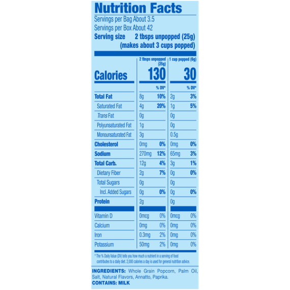 Details Ingredients Whole Grain Popcorn, Palm Oil, Salt, Natural and Artificial Flavor [Milk], Color Added, Freshness Preserved by TBHQ. Product features Who wouldn’t want more of a good thing? This is popcorn with butter, butter and more creamy butter flavor. Pop Secret is your secret to movie night. Microwaveable and easy to serve, every kernel is a delicious burst of taste in your mouth. Contains no artificial preservatives, flavors, or dyes. Fluffy popcorn with butter, butter and more creamy butter flavor100% whole grain; Non-GMO corn, 0g trans fat, No sugar addedFamily Size box contains 12 microwavable popcorn bagsPop up delicious warm popcorn with an irresistible aroma and flavor, ready in minutesAt Pop Secret, we do butter better! Net Quantity of Content ABOUT 34 X 2 Tbsp