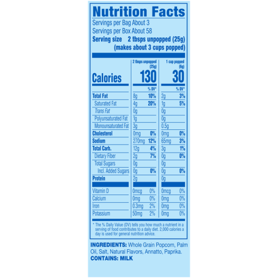Details Ingredients WHOLE GRAIN POPCORN, PALM OIL, SALT, NATURAL FLAVORS, ANNATTO, PAPRIKA. Product features Pop Secret is your secret to movie night! Bring the movie theater home with this slightly sweeter butter flavor and classic crunch. Microwaveable and easy to serve, every kernel is a delicious burst of taste in your mouth. And it contains no artificial preservatives, flavors, or dyes. Bring the movie theater home with this slightly sweeter butter flavor and classic crunch 100% whole grain; Non-GMO corn, 0g trans fat, No sugar added 18 shareable microwave popcorn bags per box Pop up delicious warm popcorn with an irresistible aroma and flavor, quick and easy A great buttery snack for movie night, TV watching, family game time, or anytime! Net Quantity of Content ABOUT 51 X 2 Tbsp