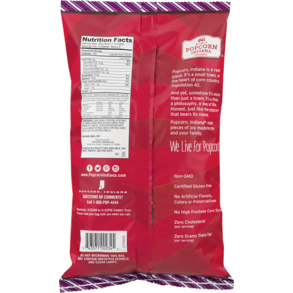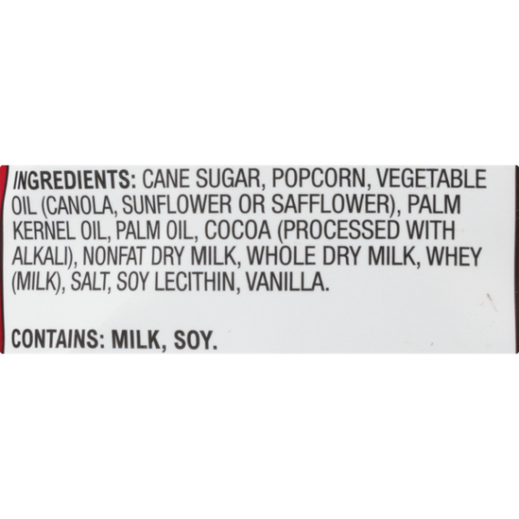 Details Ingredients Cane Sugar, Non-GMO Popcorn, Non-GMO Vegetable Oil (Canola, Sunflower, Soybean or Safflower), Palm Kernel Oil, Palm Oil, Cocoa (Processed with Alkali), Nonfat Dry Milk, Whole Dry Milk, Whey (Milk), Salt, Soy Lecithin, Vanilla. Show more Product features Popcorn Indiana Kettlecorn, Black & White, Drizzled Popcorn Indiana Black & White Drizzlecorn, 6 Oz. Net Quantity of Content 6 X 28.00 g