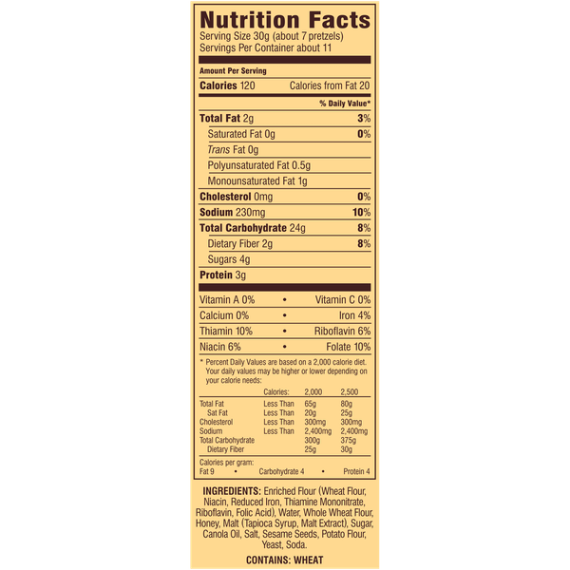Details Ingredients Enriched Flour (Wheat Flour, Niacin, Reduced Iron, Thiamine Mononitrate, Riboflavin, Folic Acid), Water, Whole Wheat Flour, Honey, Malt (Tapioca Syrup, Malt Extract), Sugar, Canola Oil, Salt, Sesame Seeds, Potato Flour, Yeast, Soda. Show more Product features Honey Wheat Braided Twists combine whole wheat flour, real honey and sesame seeds for a delicately sweet taste experience in an attractive, easy-to-eat shape. Savor the hearty flavor and delicious crunch of Snyder's of Hanover pretzels. Whole wheat flour, real honey and sesame seedsA delicately sweet taste experience in a twist shapeGreat for dipping and snacking after school, at parties or on-the-goNon-GMO Project Verified12 oz bag is perfect for sharing with friends and family Net Quantity of Content 11 X 30.0