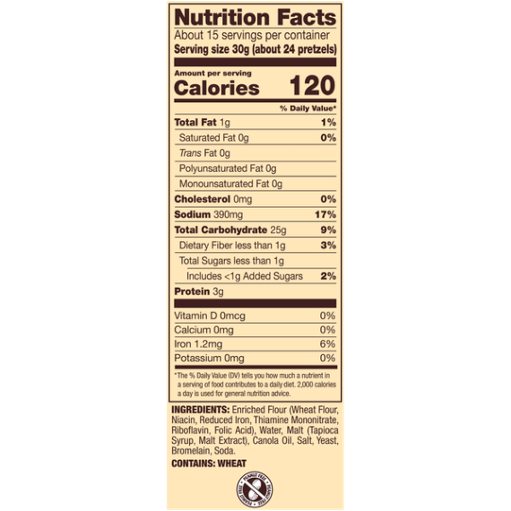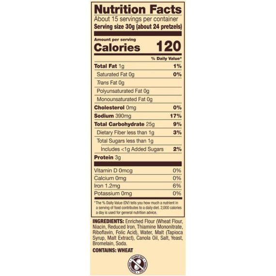 Details Ingredients Enriched Flour (Wheat Flour Niacin, Reduced Iron, Thiamine Mononitrate, Riboflavin, Folic Acid), Water, Malt (Tapioca Syrup, Malt Extract), Canola Oil, Salt, Yeast, Bromelain, Soda. Show more Product features Our Pretzel Snaps offer all the rich, hearty flavor of traditional pretzels in a crunchy, checkerboard shape. Theyre perfect for stacking, sandwiching and scooping. Snyder's of Hanover pretzels in a crunchy checkerboard shapeOnly 1 gram fat per servingNon-GMO Project Verified; Made in a peanut-free facility (safe for schools!)Perfect for stacking, sandwiching and scooping your favorite dipsLarge 16 oz size is perfect for parties and sharing with friends! Special Features No trans fat Net Quantity of Content 15 X 30.0